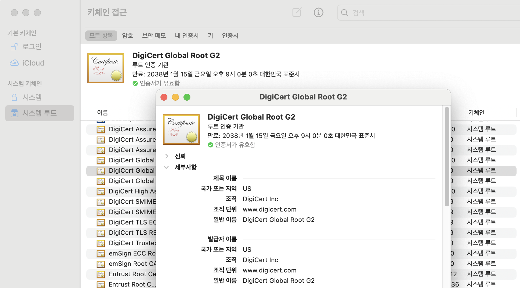 mac m2 환경에서는 spotlight > 키체인 접근 > 시스템 루트를 확인하면 Root CA의 인증서들이 존재합니다.
